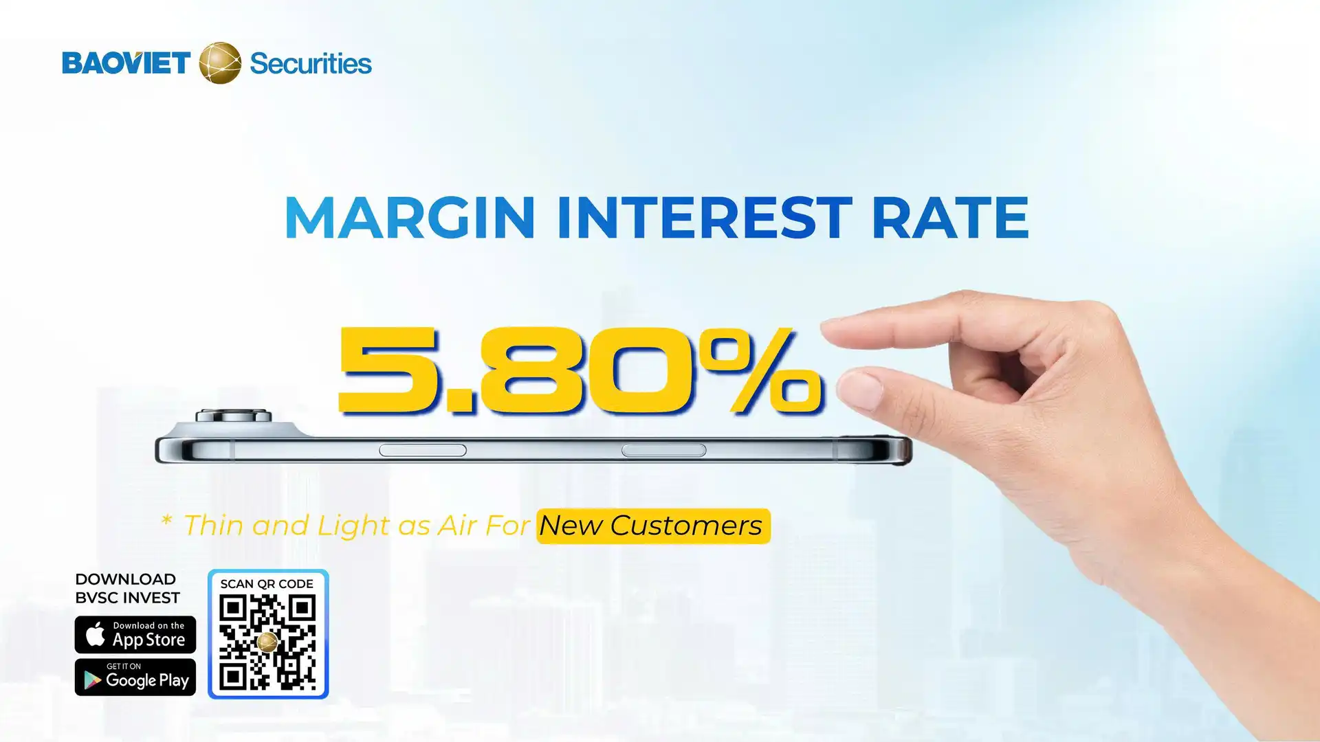 In the context of the stock market being officially upgraded from a frontier market to an emerging market, and with the desire to bring more value and utilities to Investors, Bao Viet Securities (BVSC) officially continues to implement a Margin interest rate preferential program starting from only 5.8% for New Customers who participate in investing with BVSC. The program details are as follows: