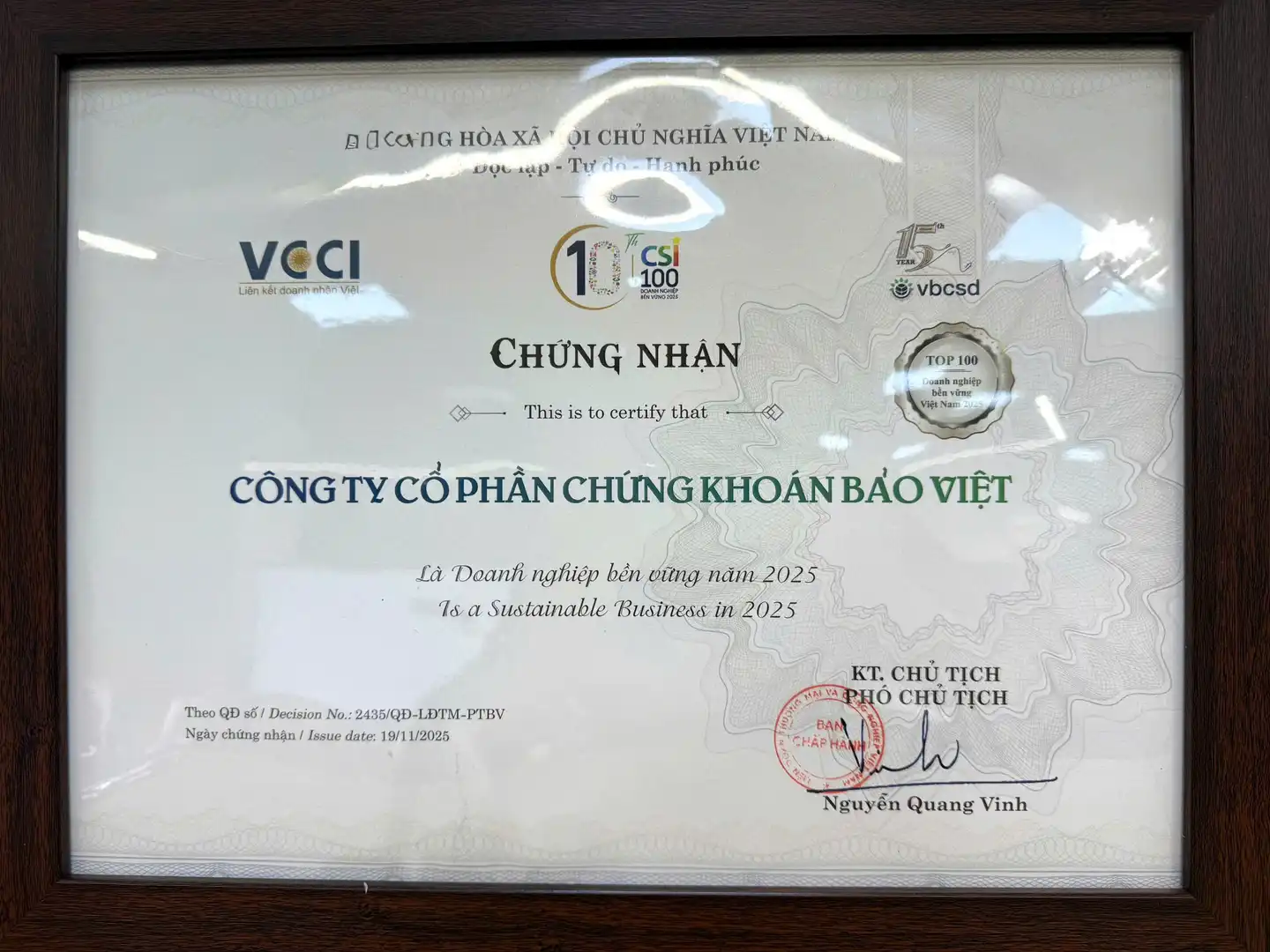 Song hành cùng việc được vinh danh tại CSI 2025, trong tháng 12 vừa qua BVSC tiếp tục khẳng định năng lực quản trị khi xuất sắc lọt Top 10 Doanh nghiệp Quản trị Công ty Tốt nhất Nhóm Vốn hóa Vừa. Giải thưởng ghi nhận hành trình 26 năm BVSC kiên định theo đuổi chuẩn mực quản trị minh bạch, chuyên nghiệp, tuân thủ thông lệ quốc tế và không ngừng đổi mới để góp phần củng cố niềm tin thị trường, tạo nền tảng vững chắc cho sự phát triển bền vững trong tương lai.
