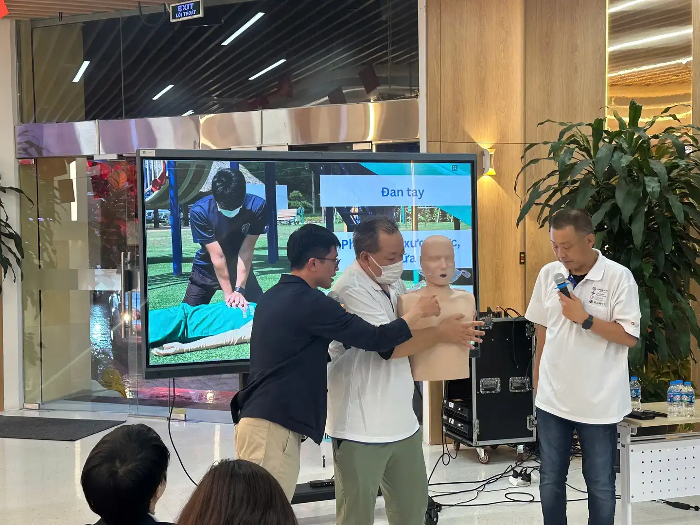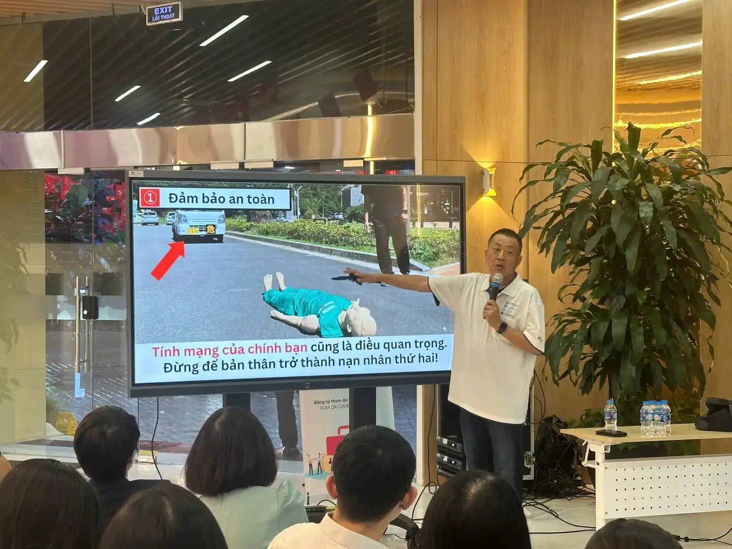 Buổi học được Bác sĩ Tatsuo Takama – Phó Giám đốc Trung tâm Cấp cứu và chuyên viên Masatoshi Imamura trực tiếp hướng dẫn, giúp học viên nắm vững kỹ năng BLS (Basic Life Support) – hỗ trợ sự sống cơ bản trong tình huống ngừng tim đột ngột.