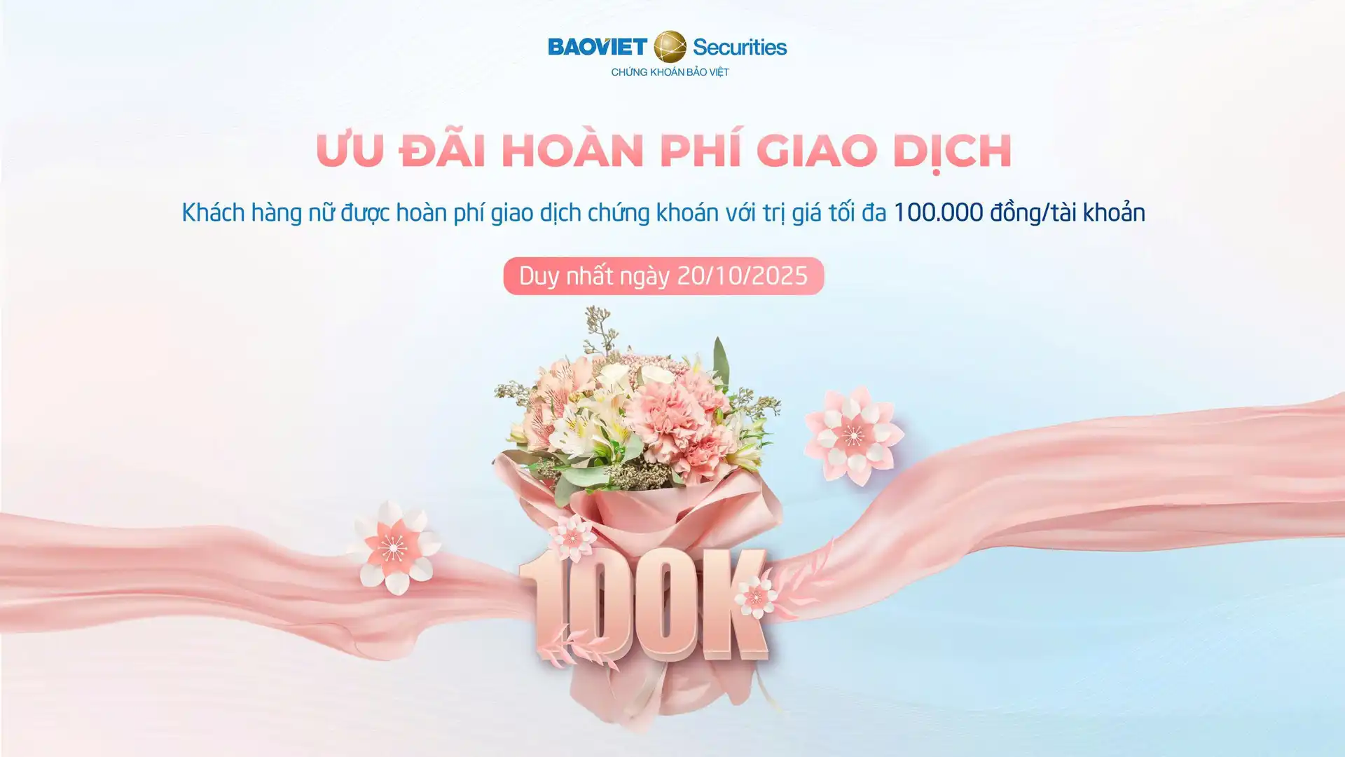 Nhằm tri ân và gửi lời chúc tốt đẹp đến các khách hàng nữ nhân dịp ngày Phụ nữ Việt Nam 20/10, CTCP Chứng khoán Bảo Việt (BVSC) ra mắt chương trình ưu đãi hoàn phí giao dịch chứng khoán 100.000đ/tài khoản dành cho tất cả các khách hàng nữ có phát sinh giao dịch trong ngày 20/10/2025.