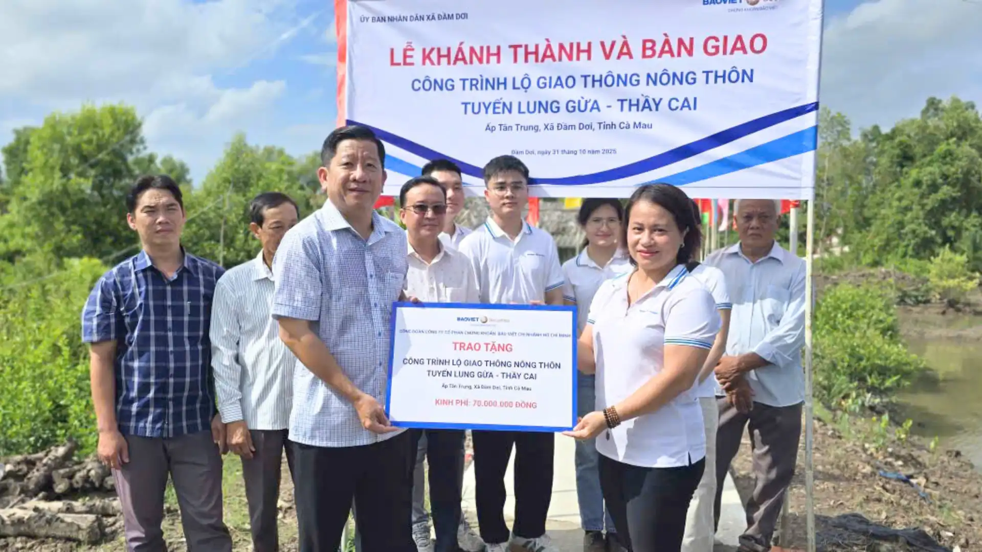 Ngày 31/10/2025, BCH Công đoàn Chứng khoán Bảo Việt - Chi nhánh HCM đã có mặt tại xã Đầm Dơi, tỉnh Cà Mau để thực hiện lễ khánh thành và bàn giao công trình lộ giao thông nông thôn với tống giá trị 70 triệu đồng, góp phần giúp người dân và học sinh địa phương thuận tiện hơn việc di chuyển phục vụ cho hoạt động sinh hoạt, học tập và sản xuất hằng ngày.