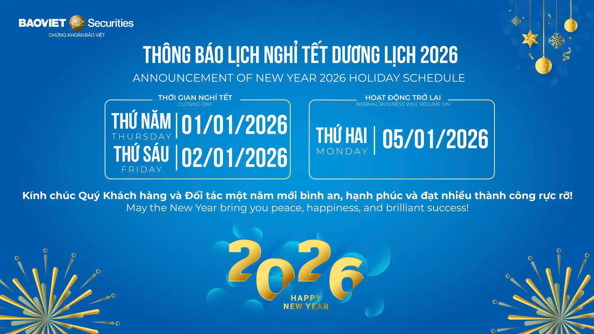 Công ty Cổ phần Chứng khoán Bảo Việt (BVSC) xin trân trọng thông báo tới Quý Khách hàng và Đối tác lịch nghỉ Tết Dương lịch 2026 cụ thể như sau: