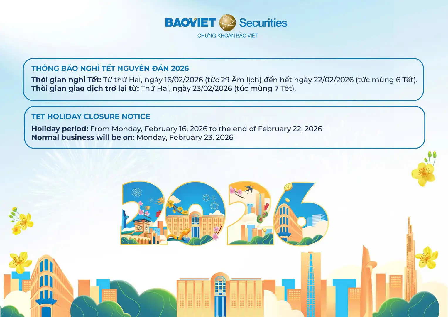 Một năm cũ đã qua và một năm mới sắp đến. Công ty cổ phần Chứng khoán Bảo Việt (BVSC) trân trọng cảm ơn sự đồng hành của Quý khách trong năm vừa qua và kính chúc Quý khách một kỳ nghỉ Tết Bính Ngọ 2026 thật bình an, nhiều sức khỏe và hạnh phúc bên gia đình, người thân.